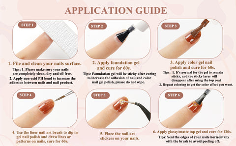 Package Includes: 32 pcs gel nail polish, 1 pc foundation gel, 1 pc glossy top coat, 1 pc matte top coat, 1 pc non-acid PH bond, 2 pcs nail art stickers(Random style), 1 pc nail file and 3 pcs liner nail art brushes.
