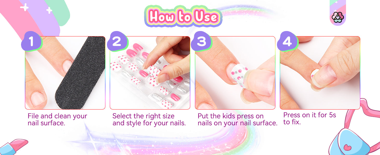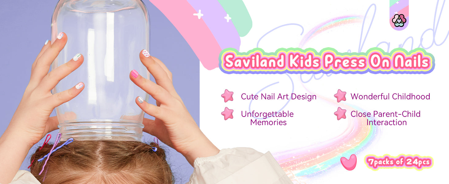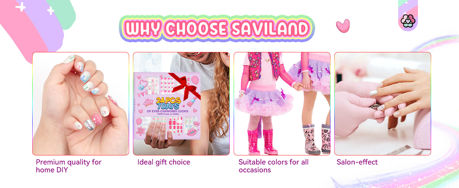 - 【Effortless Wearing】SAVILAND presents stick on nails for girls with adhesive pre-glued sticker on the back that make application a breeze. Just align the nail with your child's natural nail and firmly press it down for just 5 seconds to secure it in place. No messy glue or complicated techniques required, quick & easy. Perfect nail art gift for kids on birthdays, Thanksgiving, Christmas, New Year's Day and more.