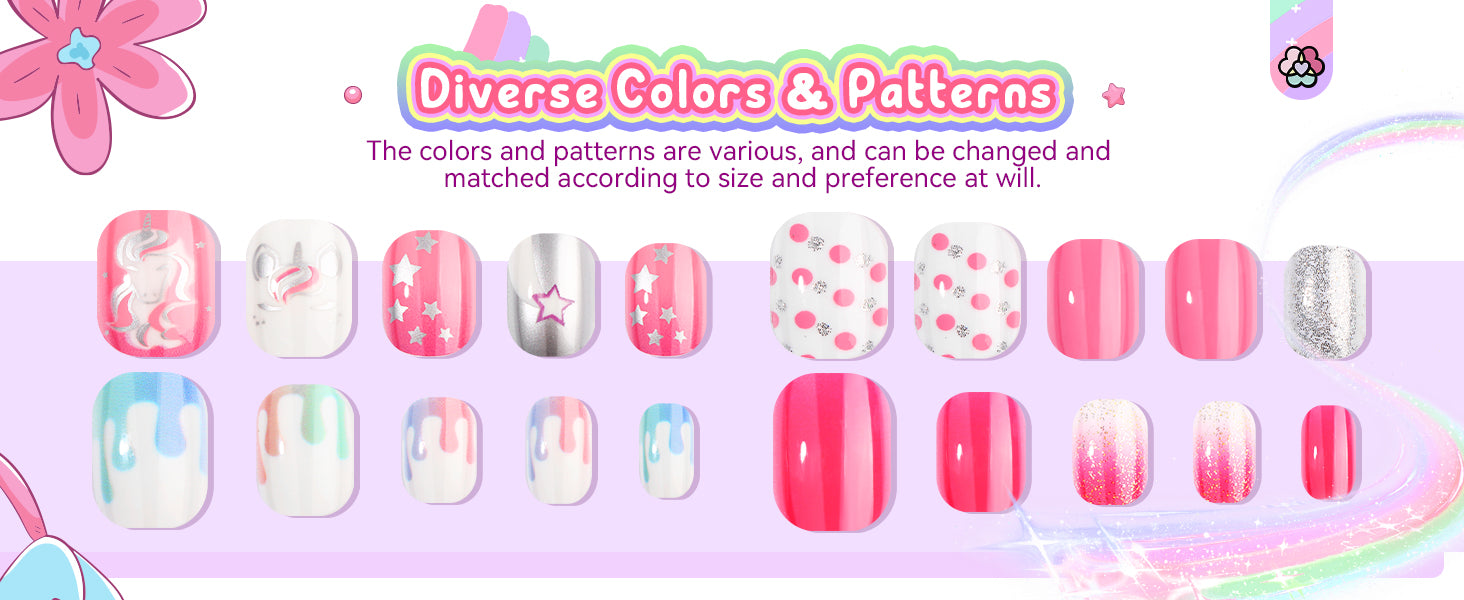 - 【Kids Press on Nails for Girls】SAVILAND kids fake nails presents a delightful set of 168 pcs little girls press on nails in various sizes and captivating patterns. Inspire your child's imagination and watch their creativity with these fun and safe little girl press on nails. Easy for kids to create various & one-of-a-kind nail art masterpieces to meet their different dress needs.